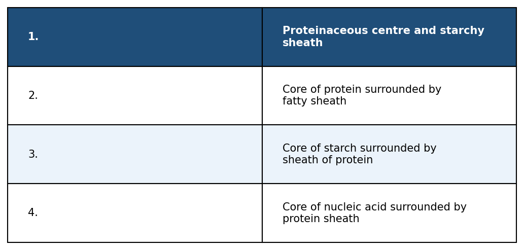 The pyrenoids are made up of 1. Proteinaceous centre and starchy sheath 2. Core of protein surrounded by fatty sheath 3. Core of starch surrounded by sheath of protein 4. Core of nucleic acid surrounded by protein sheath